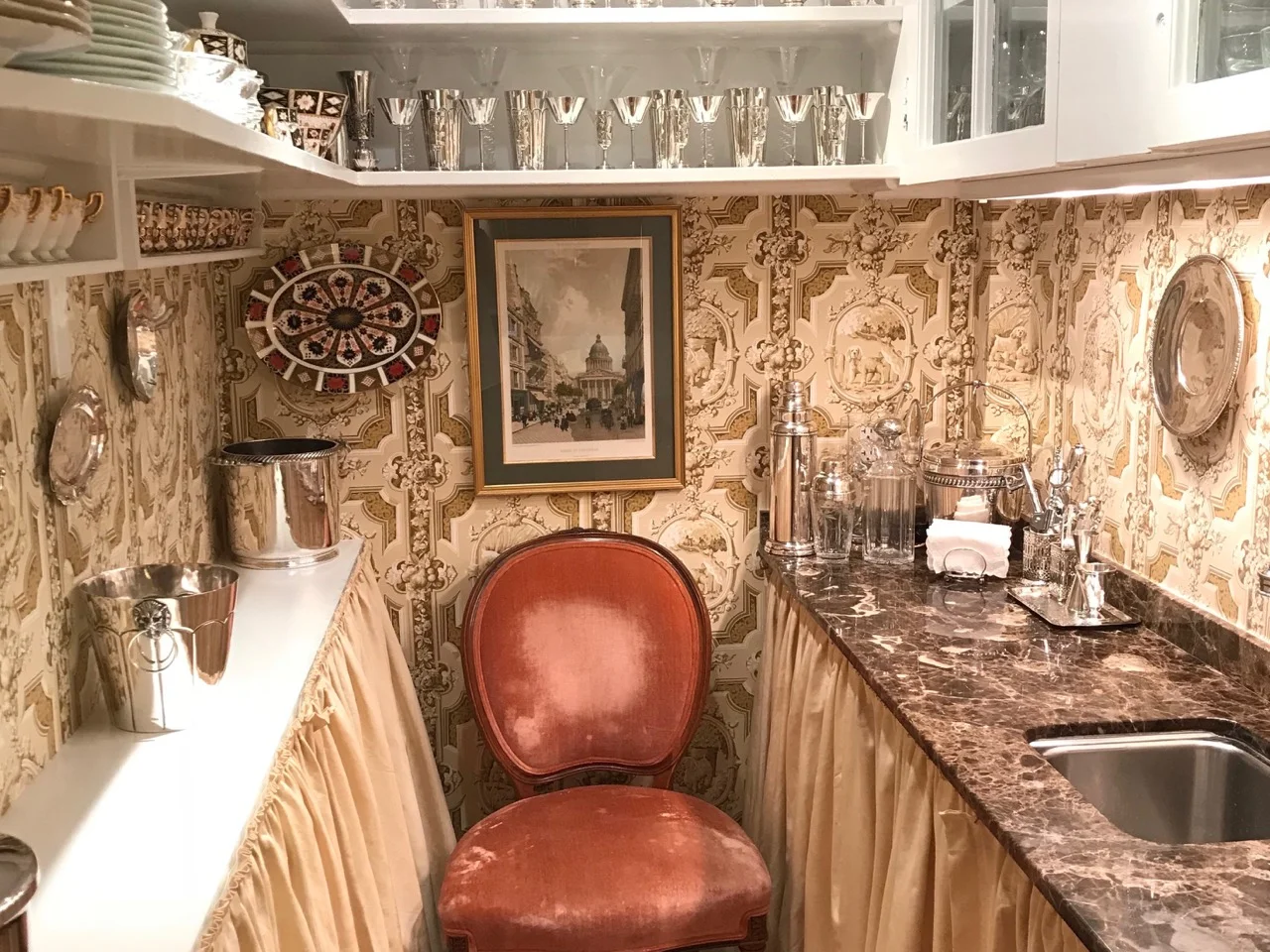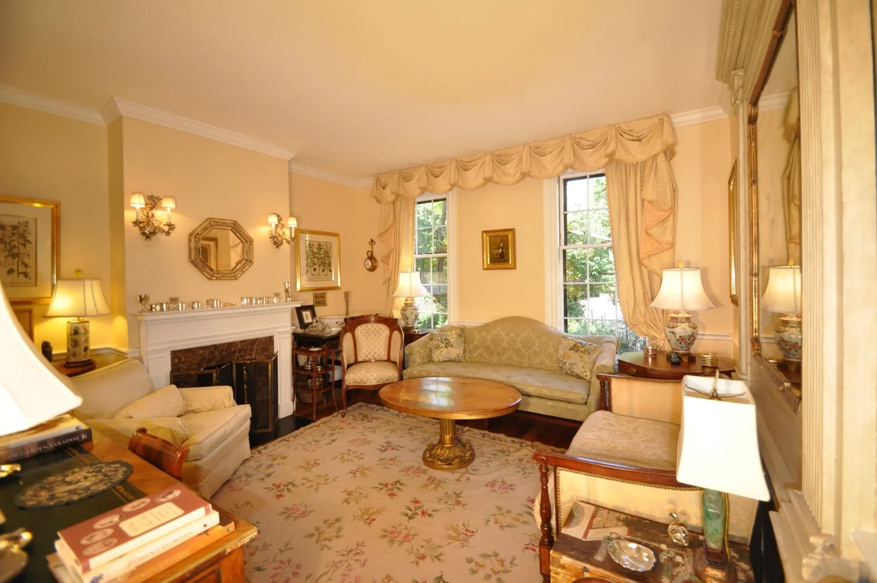 ● Handsome front facing living room with tall windows overlooking Mount Vernon Square, chair rail, chestnut floors and wet bar with cabinet and marble counter