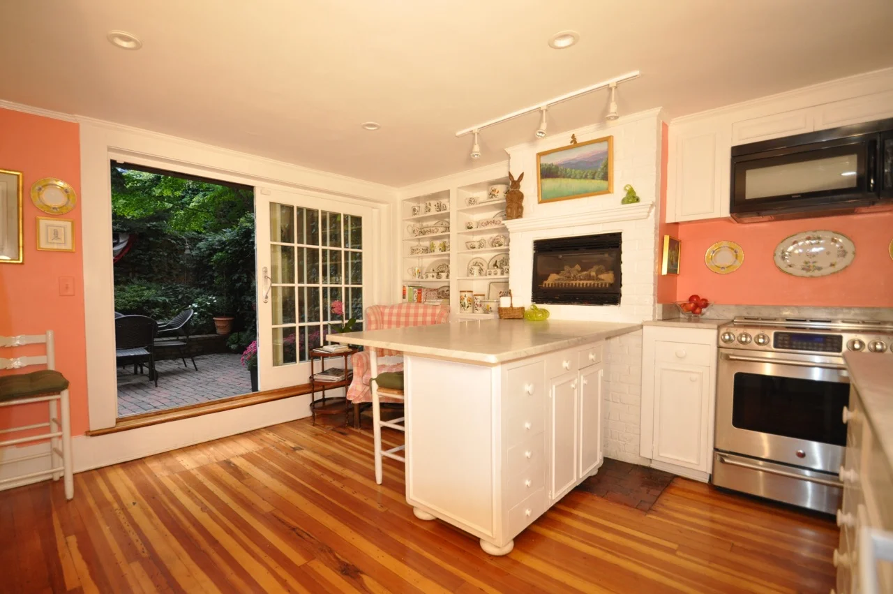 ● Country kitchen has a large island, Carrera marble countertops, a gas fireplace and sliding doors leading to garden