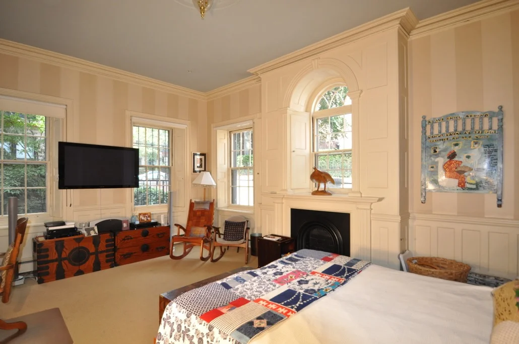 - Rear hall with closets and a tessellated marble floor leads to the corner master bedroom with built-in’s and four windows with a view of the State House