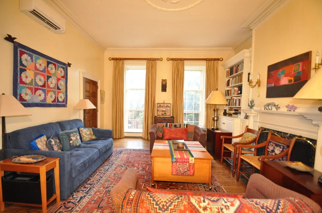 - Enter into a beautiful south facing the living room with two floor to ceiling windows, a fireplace, and built-in bookcases