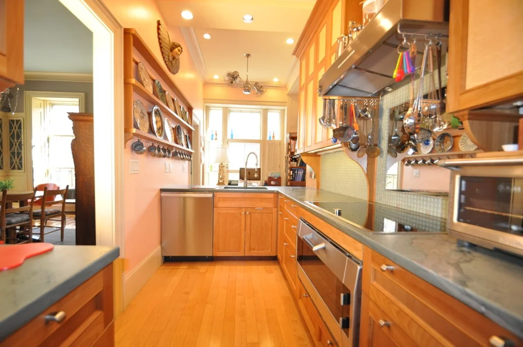 - Remodeled kitchen with top-of-the-line German appliances and an industrial cooktop has Vermont green granite countertops